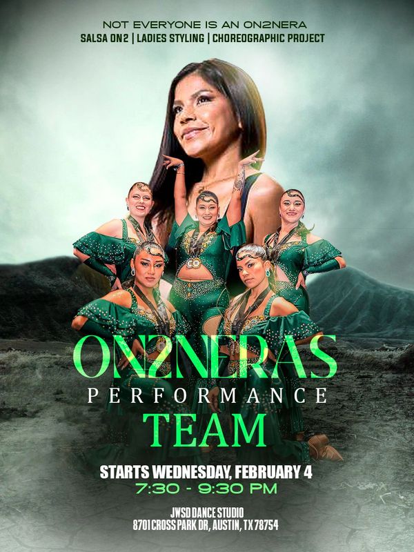 ON2NERAS is a choreographic performance team for women trained in Salsa On2 Ladies Styling who are ready to commit, grow, and perform.